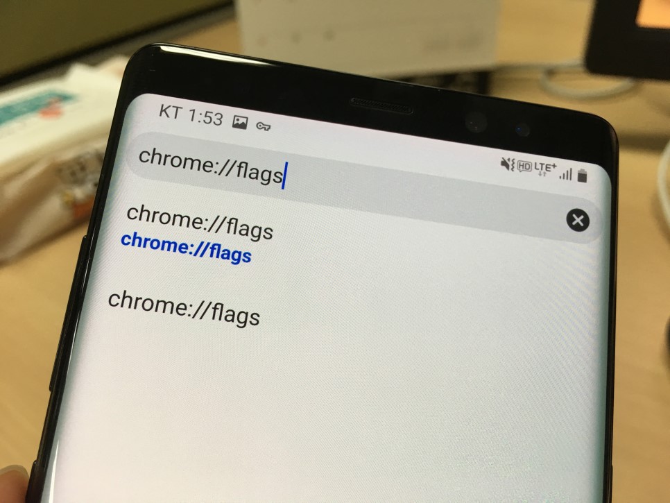 1. 안드로이드 크롬 앱 최신버전으로 업데이트 하고 실행하여 주소창에 chrome://flags 라고 입력합니다.